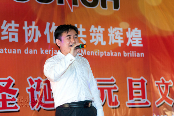 “你到我身邊,帶著微笑,流金的歲月,把你從遠(yuǎn)方帶到我的身旁”PT.SULENCO BOHUSAMI CEMENT公司董事長卓瑞瑞的一首《遲到》,在公司總經(jīng)理曾國華的即興伴舞下,把晚會(huì)氣氛推向一個(gè)新的高潮,掌聲、歡呼聲、吶喊聲,聲聲不絕,渲染了晚會(huì)歡樂的氣氛。