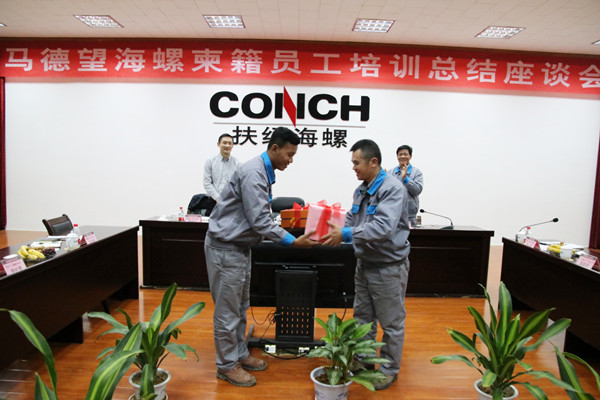 培訓(xùn)總結(jié)座談會(huì)上,八名學(xué)員在師傅的見證下對(duì)這三個(gè)月以來(lái)的收獲發(fā)表了感言,表示回國(guó)后一定不負(fù)眾望,為推動(dòng)馬德望海螺各項(xiàng)工作貢獻(xiàn)自己的力量。師傅們?yōu)橥降苋〉玫某煽?jī)感到高興,表達(dá)了師傅對(duì)徒弟的祝福與寄托?!跋M銈?cè)诨貒?guó)后能盡自己所能,把所學(xué)知識(shí)技能運(yùn)用到日常的生產(chǎn)工作中,分享給其他同事,讓他們與你們共享學(xué)習(xí)。雖然這次的培訓(xùn)已經(jīng)結(jié)束,但學(xué)習(xí)是無(wú)止境的,在后期的工作中,如果有什么困難或者疑惑,隨時(shí)可以聯(lián)系我們,我們一定會(huì)盡自己所能解決問(wèn)題?!睅煾祩惡?qiáng)感慨地說(shuō)。